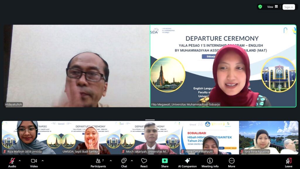 Sehari sebelum keberangkatan, Umsida mengadakan upacara pemberangkatan mahasiswa secara virtual sebagai bentuk dukungan institusional. Acara tersebut dihadiri oleh Rektor Umsida, Dr. Hidayatulloh, M.Si., Wakil Rektor I, Prof. Dr. Hana Catur Wahyuni, M.ST., Direktur LKUI Umsida, Isna Fitria Agustina, M.Si., Dekan Fakultas Psikologi dan Ilmu Pendidikan, Dr. Septi Budi Sartika, M.Pd., Kepala Program Studi Pendidikan Bahasa Inggris, Dr. Fika Megawati, M.Pd., staf Kantor Internasional Riza Mafiroh, S.Pd., dan mahasiswa peserta program, Moch. Jakariyah.
