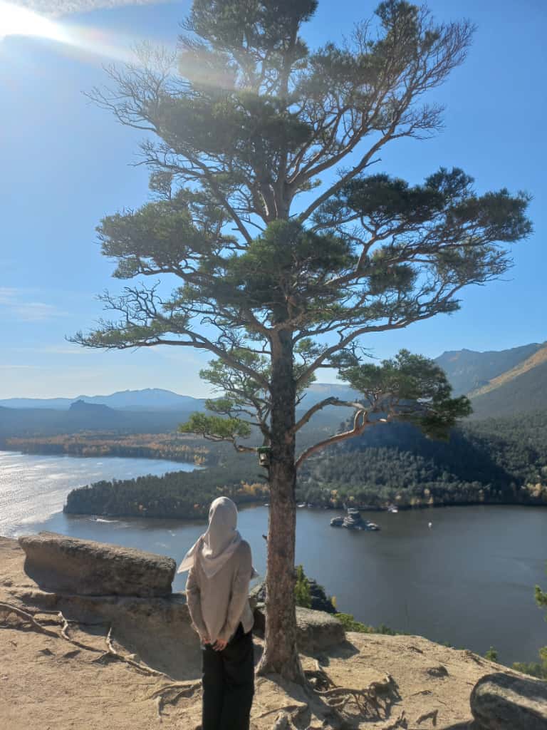 Felicia berhenti sejenak di puncak gunung untuk menikmati panorama Burabay dari atas. Ia berkata kepada temannya bahwa pendakian sejauh itu sama sekali tidak sia-sia. Rasa lelah seakan menghilang, digantikan oleh rasa bangga dan ketenangan yang mendalam.